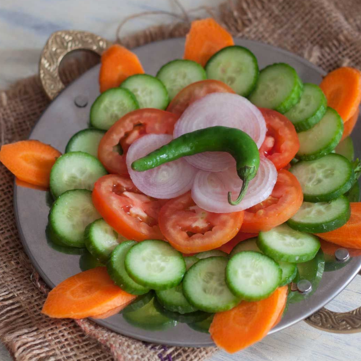 Tradičný indický šalát s mrkvou, uhorkou, paradajkou a cibuľkou.