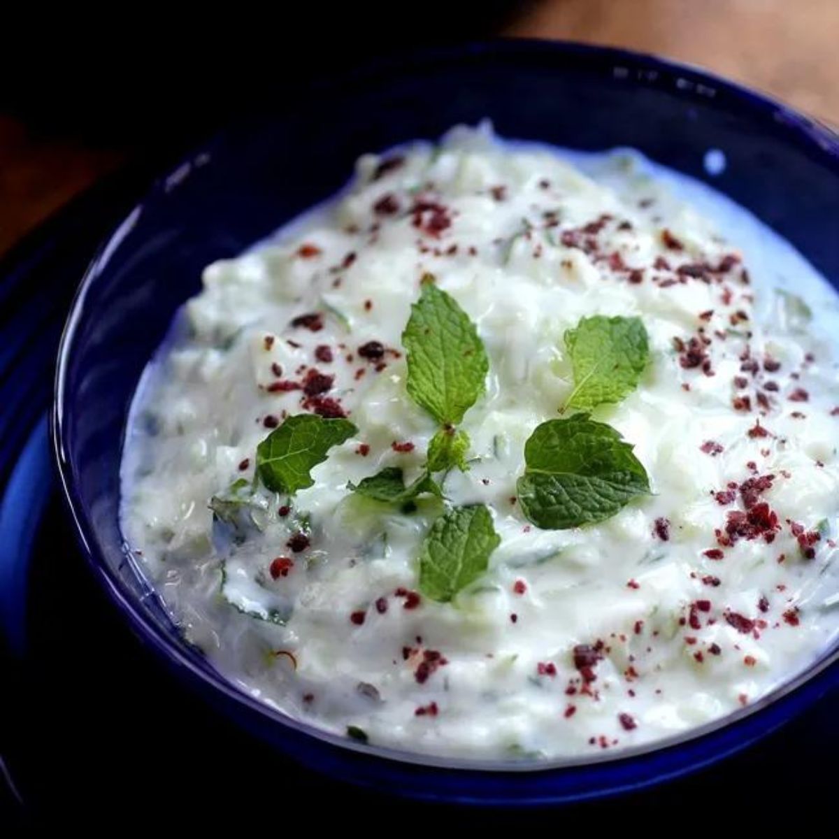 Raita je typická príloha v indickej kuchyni, pripravovaná z jogurtu so zeleninou, uhorkou a mätou.