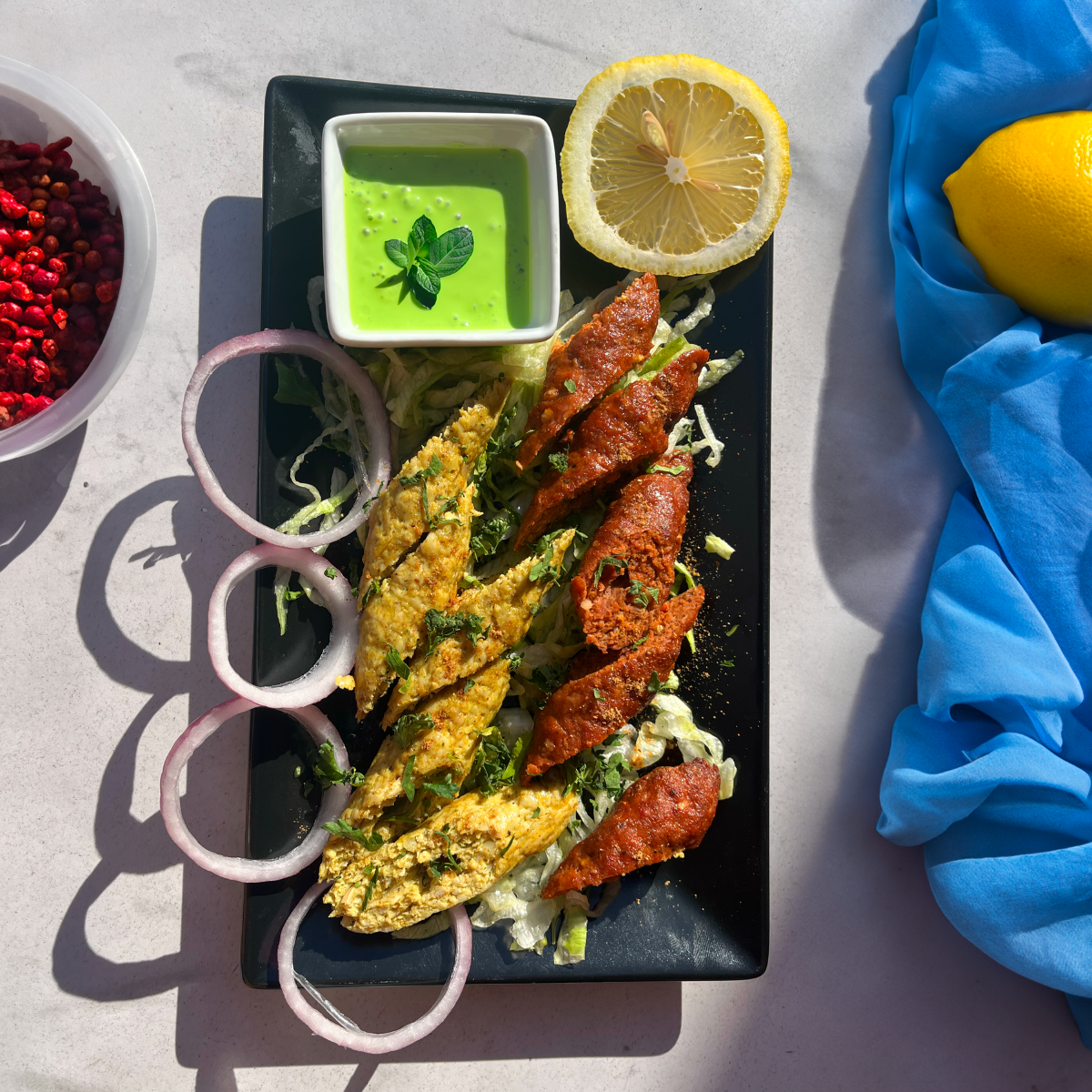 Mix jahňacieho a kuracieho mäsa v kebabe, podávaný s čatní omáčkou.