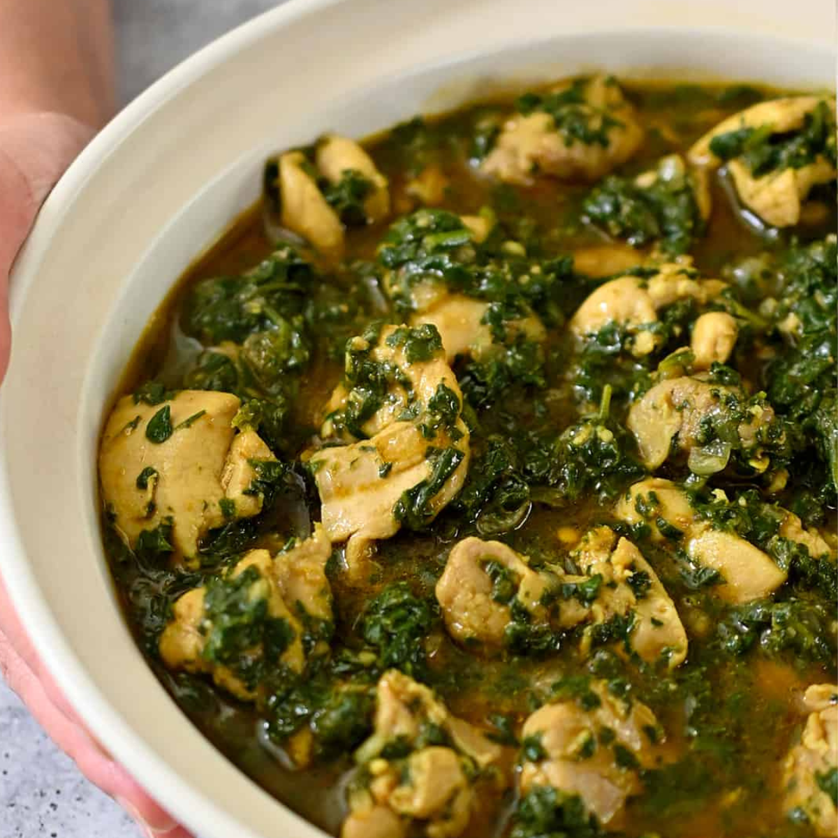 Kúsky pečeného kuracieho mäsa v špenátovo-smotanovej omáčke so štipkou rasce a poliate smotanou a maslom.